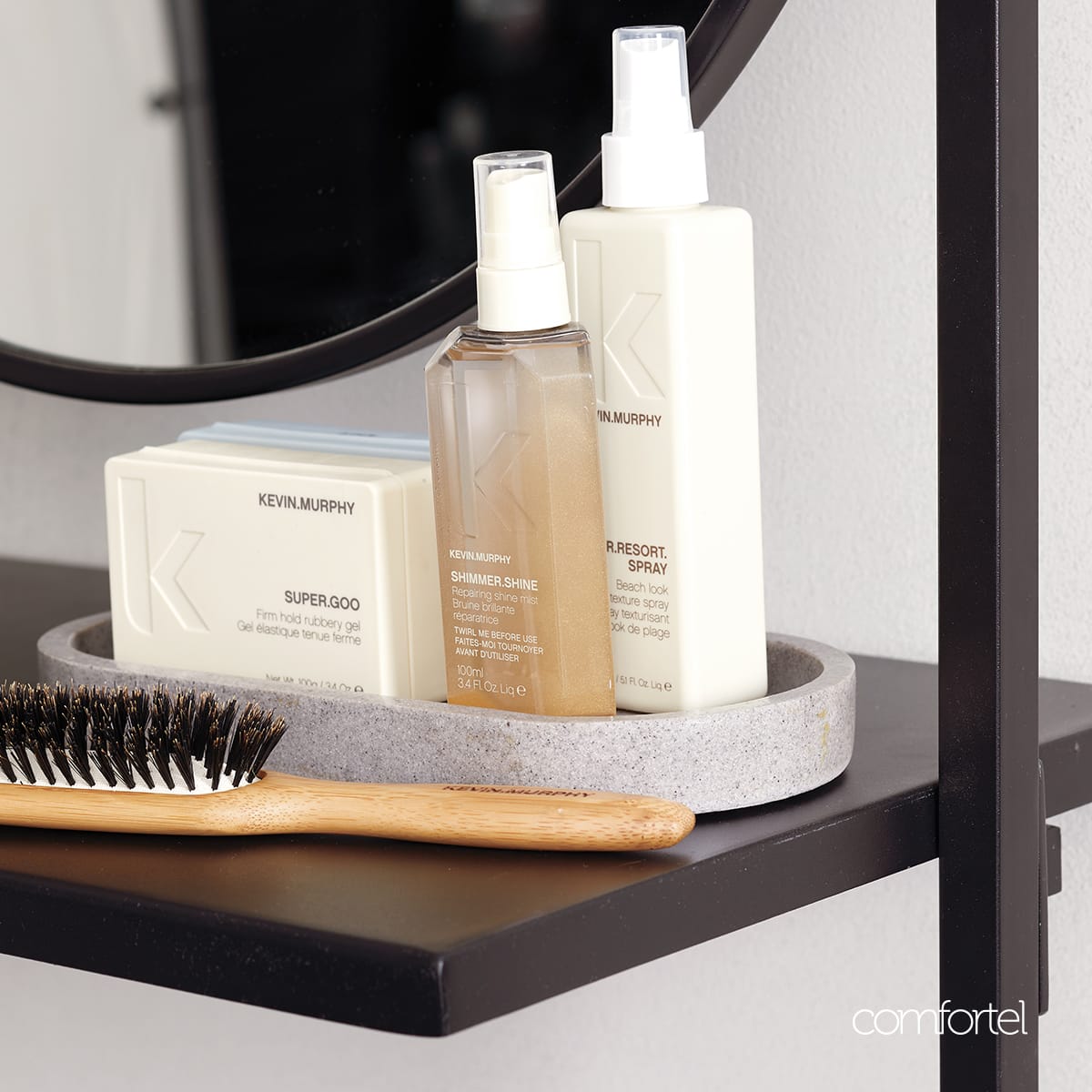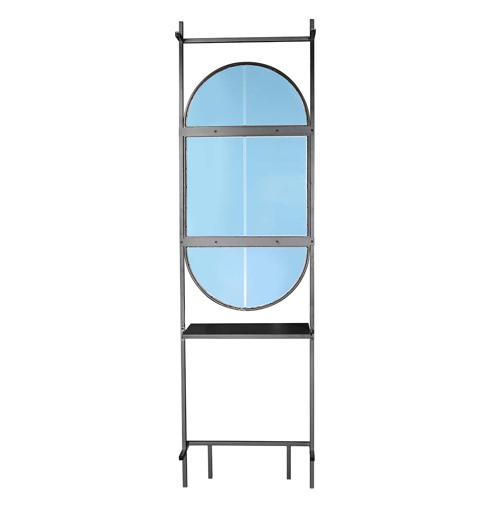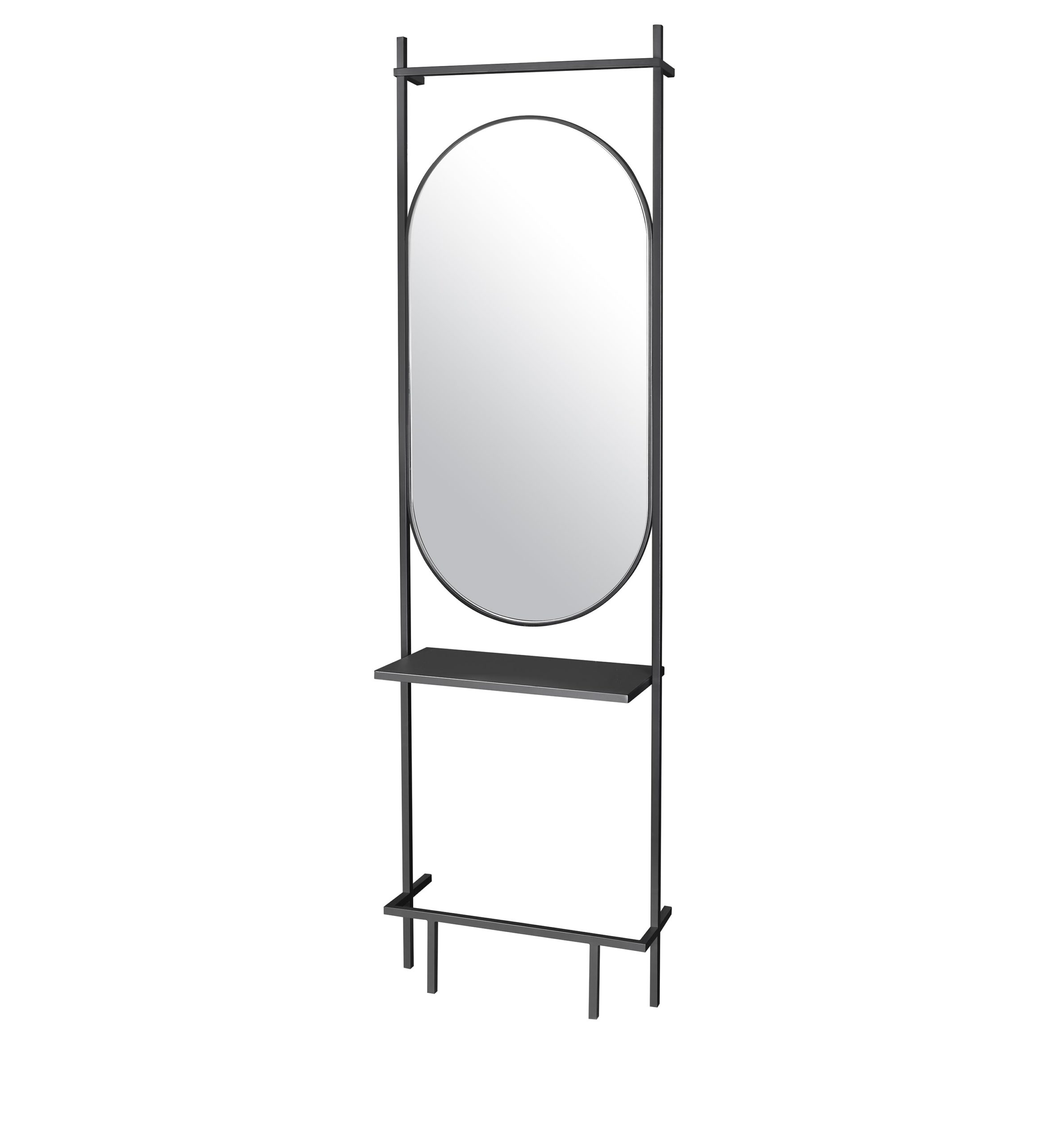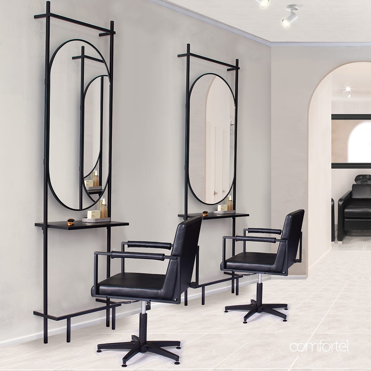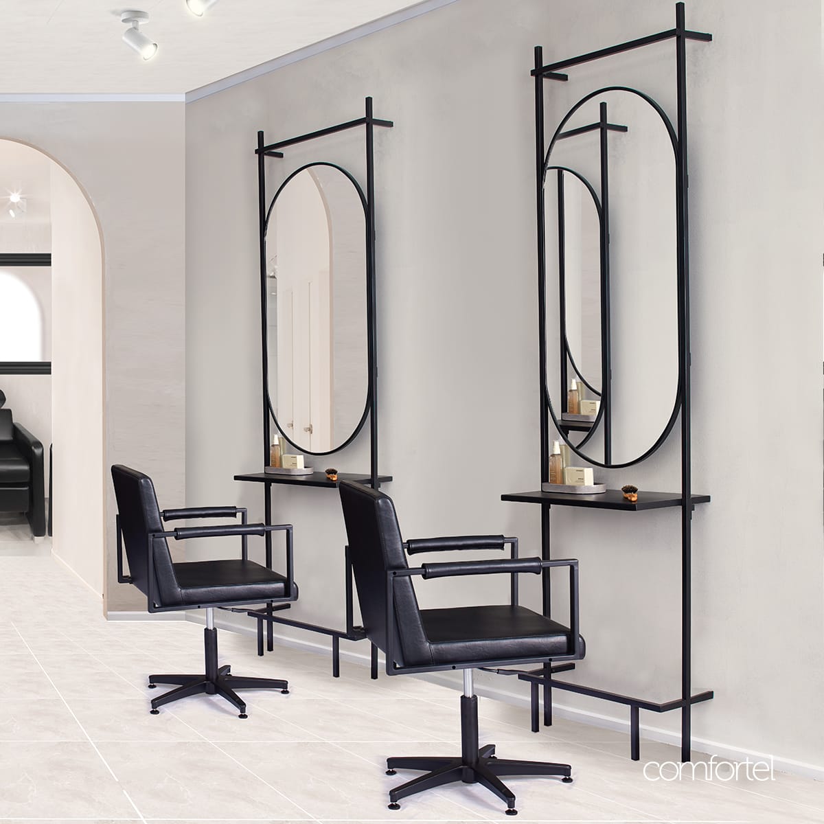 For the modernist, who likes clean, modern design, the Pallazio salon mirror and workstation is a structural statement piece that gives a suspended, floating look within the salon. Whether you like clean and modern, or if industrial is more your style, this salon mirror can be adapted to suit your salon space. The combination of sleek lines and modern curves with incorporated workbench and footrest makes this tall, narrow salon mirror a favourite amongst salons who want more workstations in their salon, without looking over crowded.